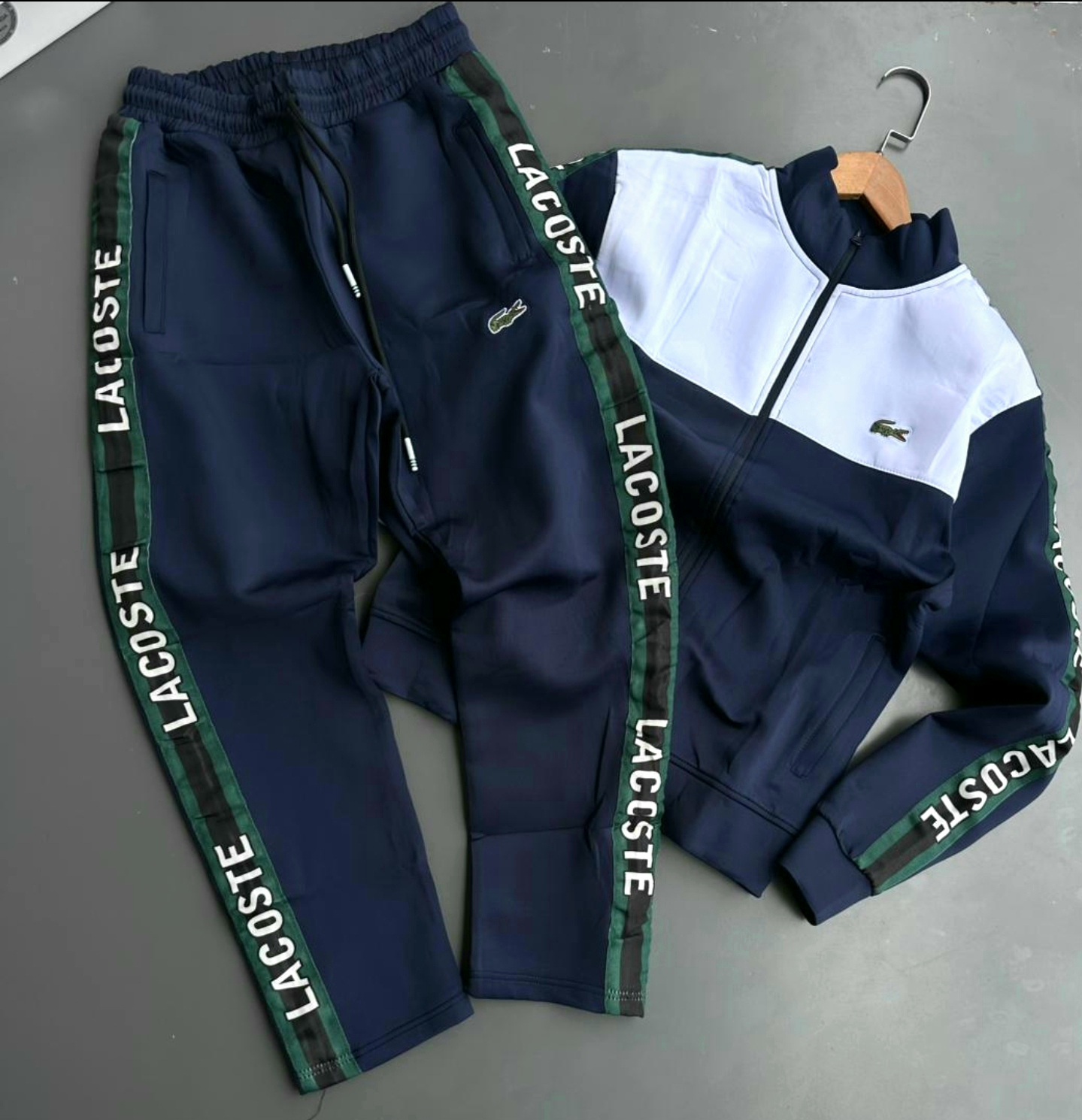 Experience the perfect blend of French elegance and athletic functionality with the Lacoste Sport Men’s Side-Stripe Tracksuit. This iconic two-piece set, rendered in a timeless Navy, White, and Green colorway, pays homage to Lacoste’s rich tennis heritage while delivering the comfort required for today’s active lifestyle.