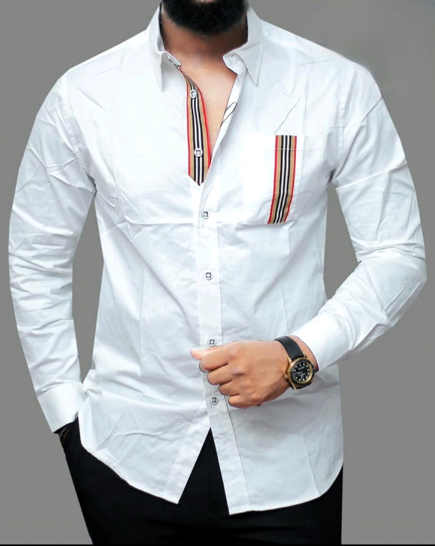 A masterclass in understated elegance. This premium white cotton button-down is defined by its meticulous attention to detail, featuring signature multi-color striped accents along the placket and chest pocket. It’s a versatile staple that bridges the gap between traditional tailoring and modern designer flair.