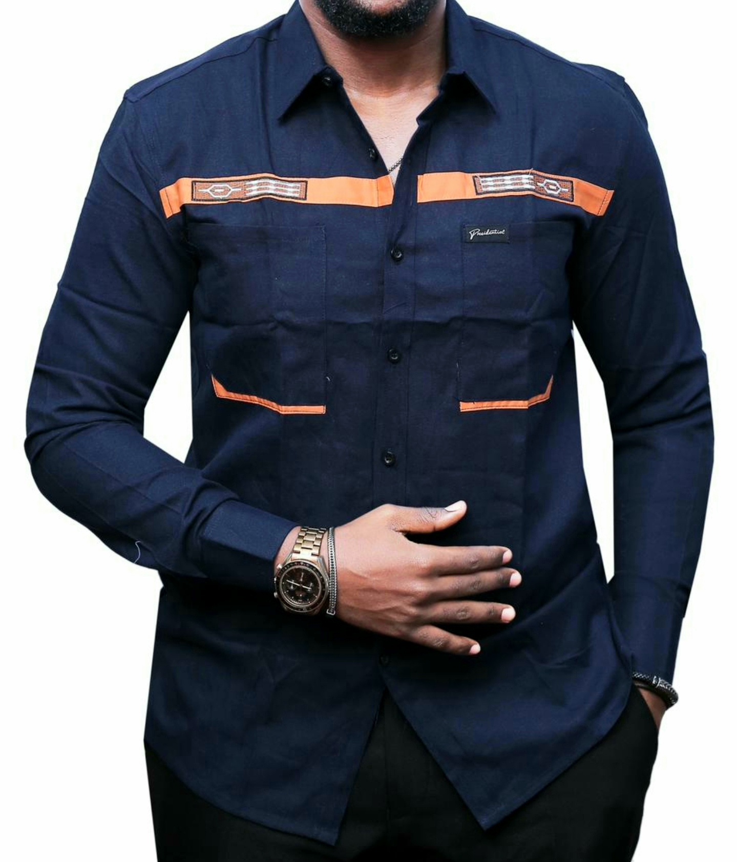 The Midnight Navy Horizon Strike is designed for the leader. This shirt features a bold, horizontal “Solar Orange” band across the chest, which serves as a canvas for intricate tribal-inspired embroidery. The deep navy body provides a slimming effect, while the bright stripe draws the eye upward to the shoulders, creating a powerful silhouette.