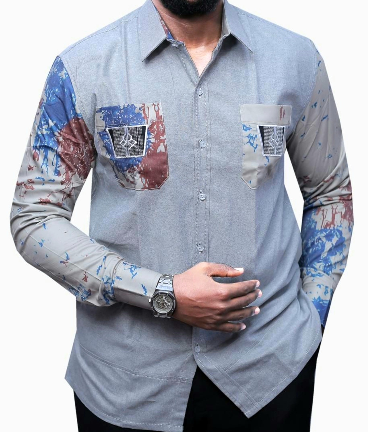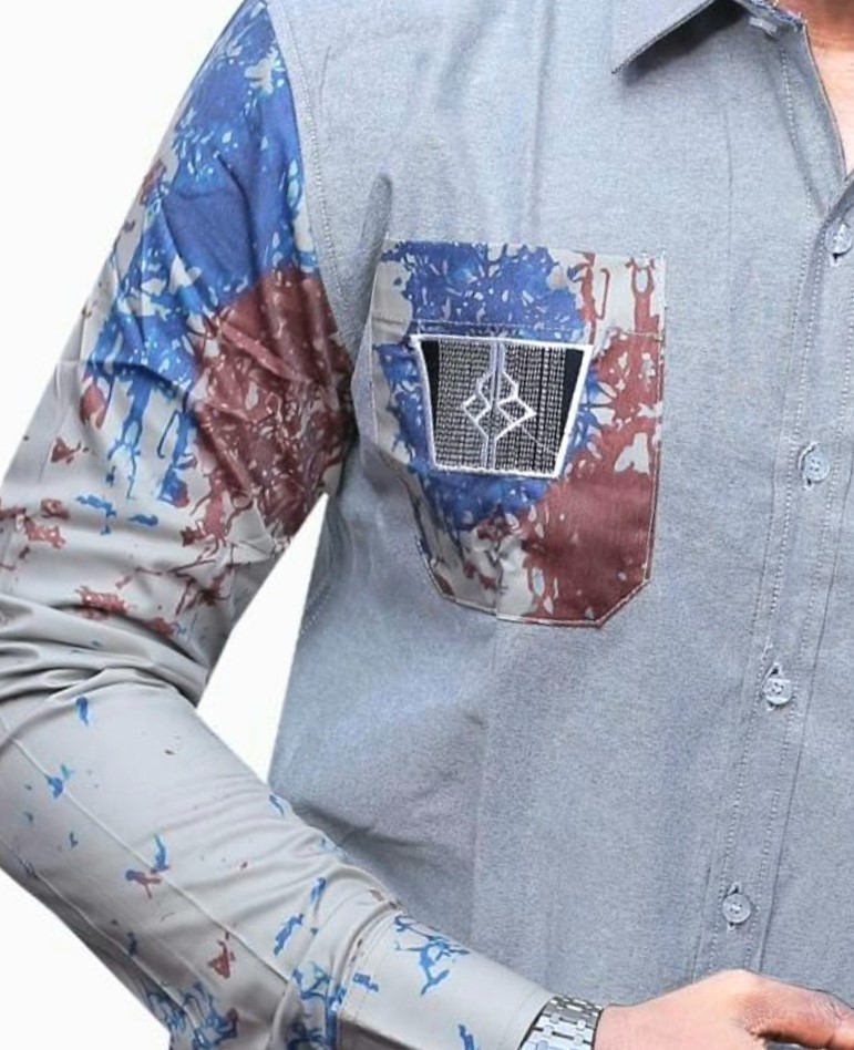 The Slate Grey Artisan offers a more “Urban Industrial” feel. The muted grey body acts as a neutral foundation, making the blue and rust-colored splatter print on the sleeves look even more vivid.