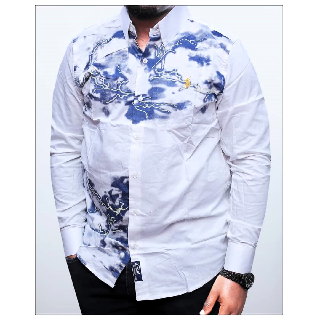 Artistry meets apparel in this striking long-sleeve cotton button-down. Featuring a unique, marble-inspired abstract print in shades of azure and deep blue against a crisp white background, this shirt is designed for those who appreciate wearable art. Its fluid design creates a dynamic look that feels both elevated and modern.
