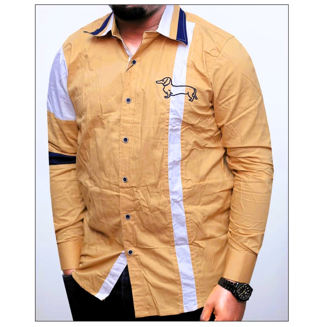 A blend of personality and precision, this cotton button-down is designed for the modern man who doesn’t take himself too seriously but takes his style very seriously. Featuring a warm tan base with striking white and navy geometric accents, this piece is defined by the charming dachshund embroidery on the chest.