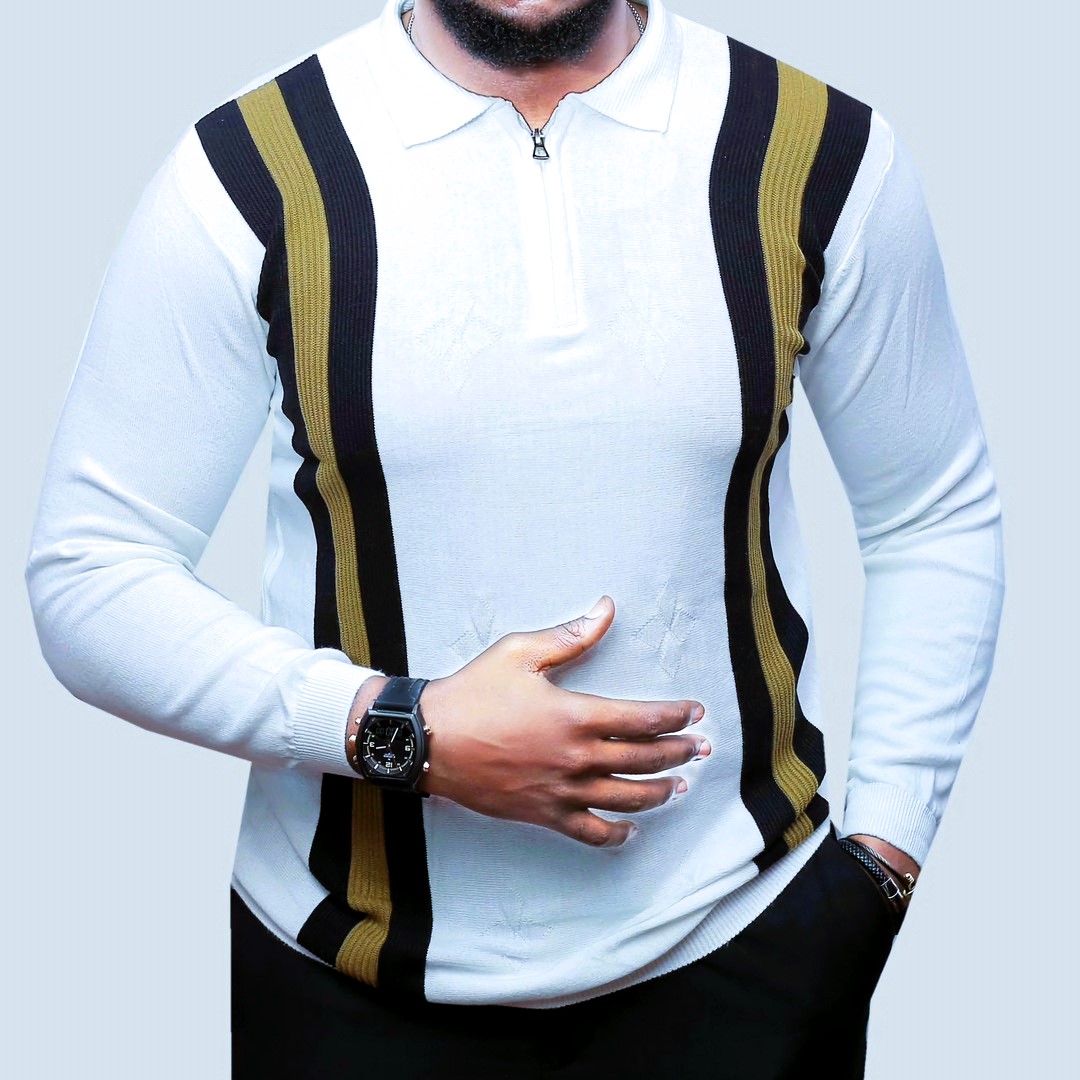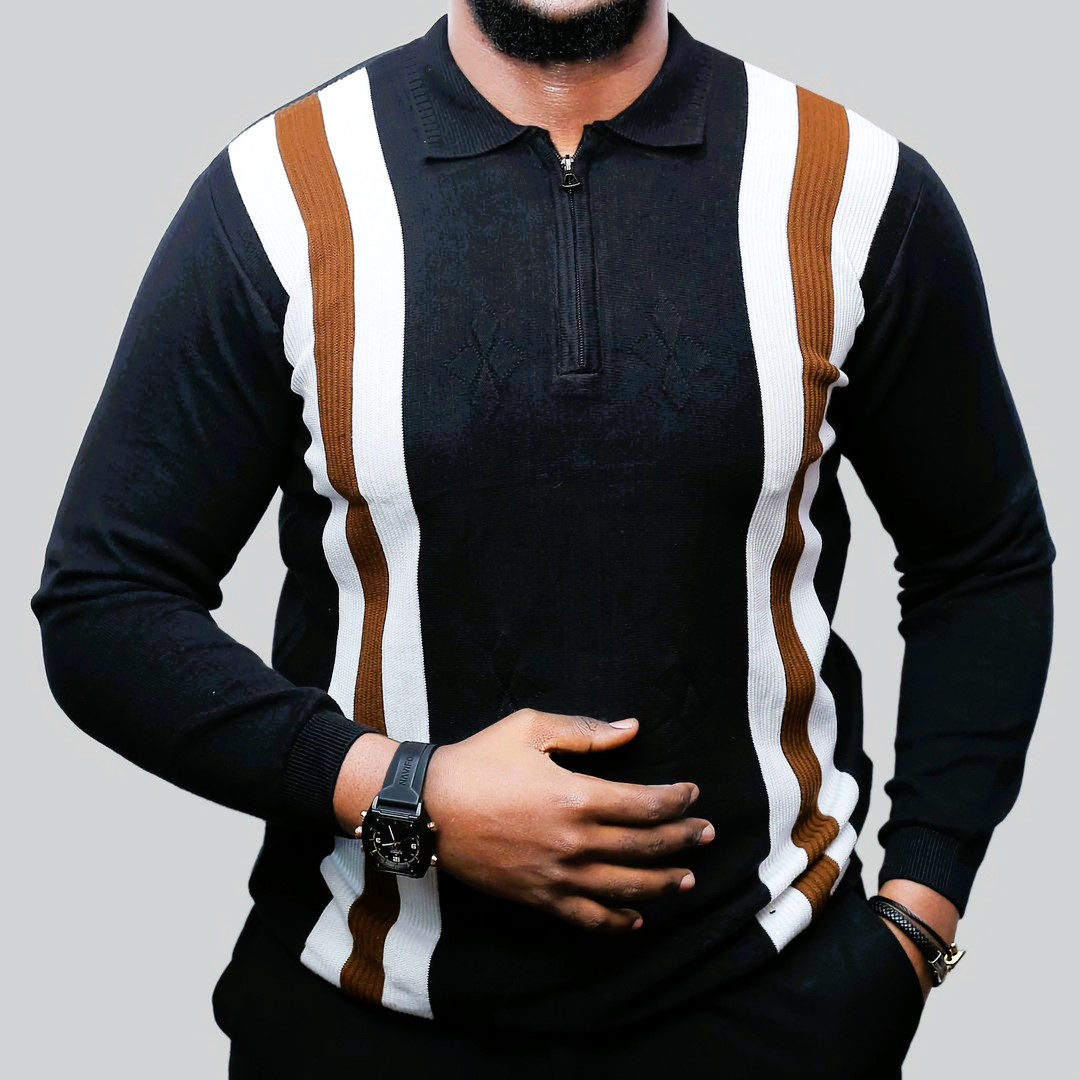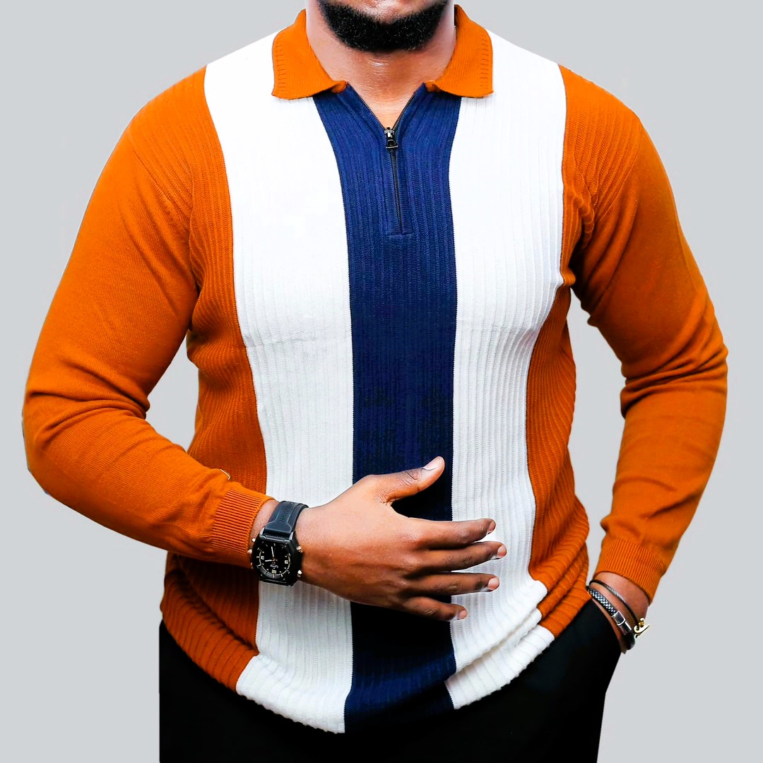 Step into the spotlight with The Icon. This quarter-zip knit is a masterclass in modern retro styling, featuring bold, vertically engineered panels of sophisticated mustard-orange, crisp optic white, and deep navy blue.