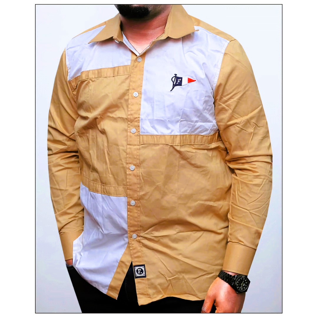 Bring a touch of coastal sophistication to your wardrobe with this multi-panel cotton button-down. Featuring a warm bold base with crisp white geometric blocking, this shirt is detailed with a signature flag-inspired embroidery on the chest. It’s the ideal piece for those who appreciate clean lines and a classic maritime influence.