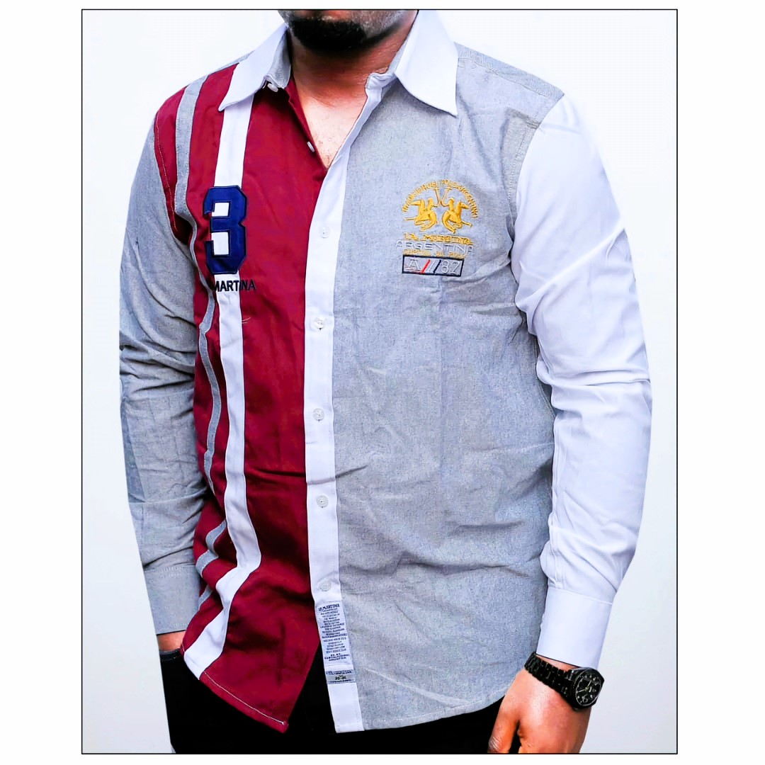 A bold, multi-tonal button-down that draws inspiration from classic racing and polo aesthetics. Featuring a striking asymmetrical split design with a rich burgundy panel, grey body, and white accents, this cotton shirt is finished with high-quality embroidery and applique details. A true standout piece for the modern wardrobe.